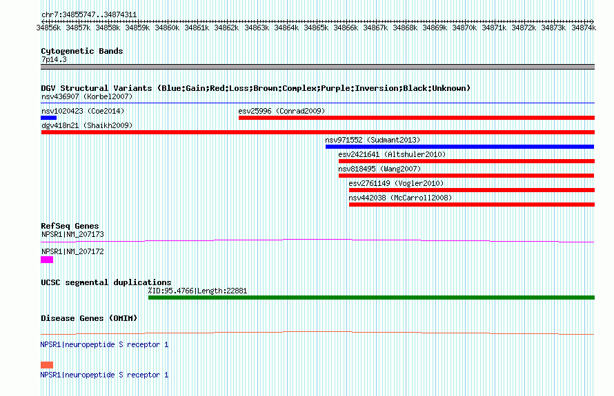 Variant DetailsVariant: nssv687420| Internal ID | 15077386 | | Landmark | | | Location Information | | | Cytoband | 7p14.3 | | Allele length | | Assembly | Allele length | | hg38 | 18565 | | hg19 | 18565 | | hg18 | 18565 | | hg17 | 18565 |