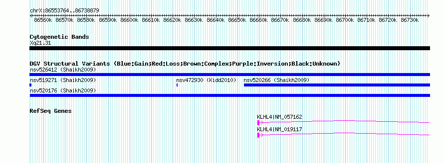 Variant DetailsVariant: nssv687425| Internal ID | 15424077 | | Landmark | | | Location Information | | | Cytoband | Xq21.31 | | Allele length | | Assembly | Allele length | | hg38 | 185116 | | hg19 | 185116 | | hg18 | 185116 | | hg17 | 185116 |