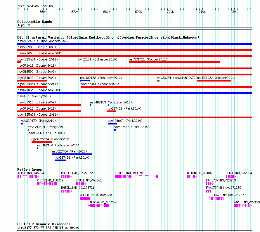 Variant DetailsVariant: nssv687635| Internal ID | 15077601 | | Landmark | | | Location Information | | | Cytoband | 16p13.3 | | Allele length | | Assembly | Allele length | | hg38 | 73375 | | hg19 | 73375 | | hg18 | 73375 | | hg17 | 73375 |