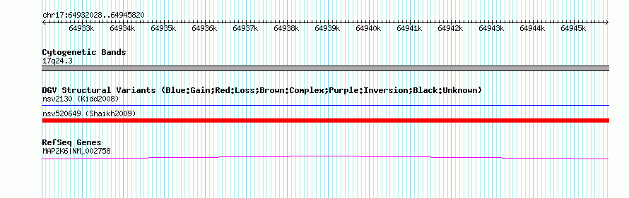 | | Variant Type | CNV loss | | Copy Number | | | Allele State | Heterozygous | | Allele Origin | | | Probe Count | | | Validation Flag | | | Merged Status | S | | Merged Variants | nsv520649 | | Supporting Variants | | | Samples | | | Known Genes | MAP2K6 | | Method | SNP array | | Analysis | Sample-level CNVs | | Platform | GPL6434 | | Comments | | | Reference | Shaikh_et_al_2009 | | Pubmed ID | 19592680 | | Accession Number(s) | nssv687714