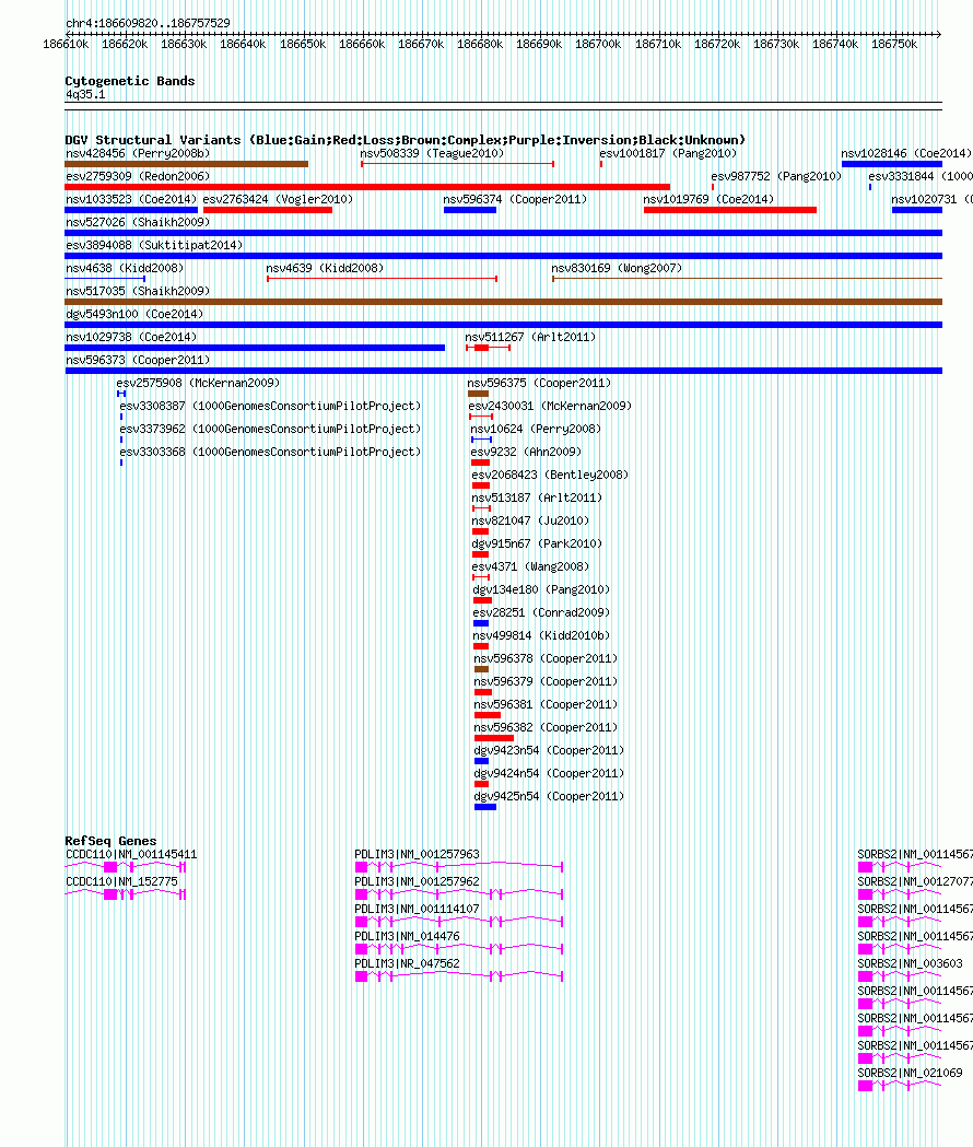 | Variant Type | CNV gain | Copy Number | | Allele State | | Allele Origin | | Probe Count | | Validation Flag | | Merged Status | S | Merged Variants | nsv517035 | Supporting Variants | | Samples | | Known Genes | CCDC110, PDLIM3, SORBS2 | Method | SNP array | Analysis | Sample-level CNVs | Platform | GPL6434 | Comments | | Reference | Shaikh_et_al_2009 | Pubmed ID | 19592680 | Accession Number(s) | nssv687893