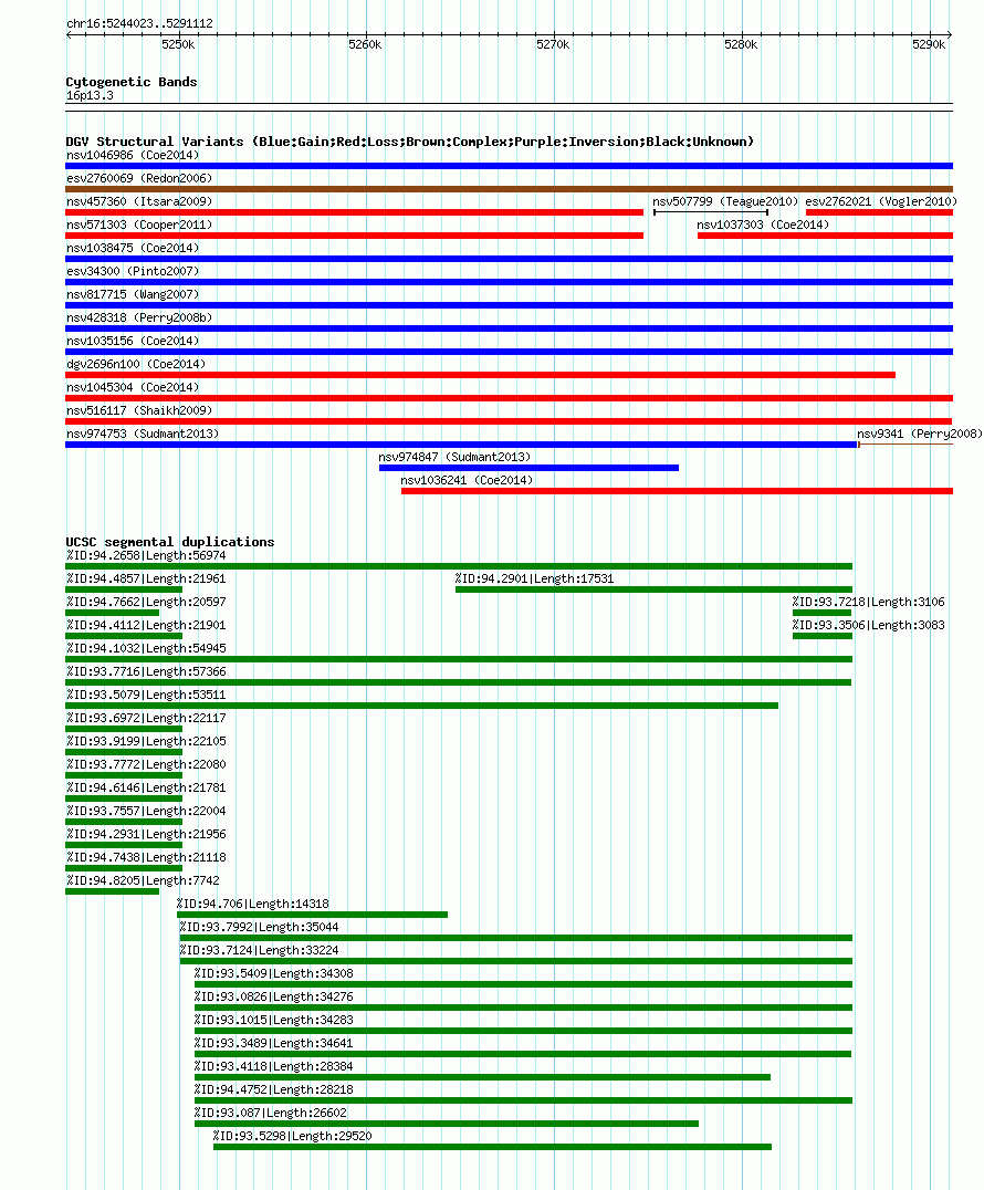 Variant DetailsVariant: nssv688261| Internal ID | 15078227 | | Landmark | | | Location Information | | | Cytoband | 16p13.3 | | Allele length | | Assembly | Allele length | | hg38 | 47090 | | hg19 | 47090 | | hg18 | 47090 | | hg17 | 47090 |