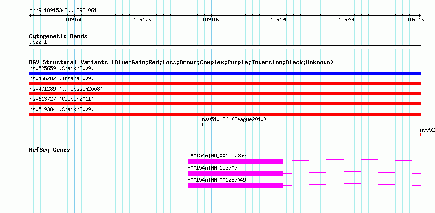Variant DetailsVariant: nssv689027| Internal ID | 15078993 | | Landmark | | | Location Information | | | Cytoband | 9p22.1 | | Allele length | | Assembly | Allele length | | hg38 | 5719 | | hg19 | 5719 | | hg18 | 5719 | | hg17 | 5719 |
