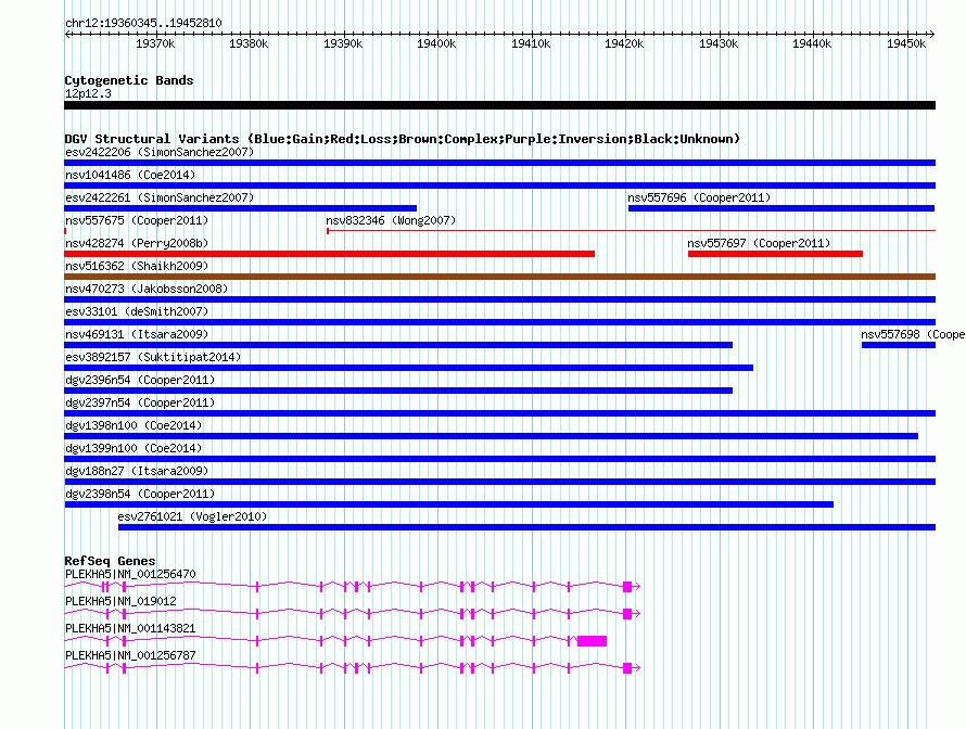 | Variant Type | CNV gain | Copy Number | | Allele State | | Allele Origin | | Probe Count | | Validation Flag | | Merged Status | S | Merged Variants | nsv516362 | Supporting Variants | | Samples | | Known Genes | PLEKHA5 | Method | SNP array | Analysis | Sample-level CNVs | Platform | GPL6434 | Comments | | Reference | Shaikh_et_al_2009 | Pubmed ID | 19592680 | Accession Number(s) | nssv689035