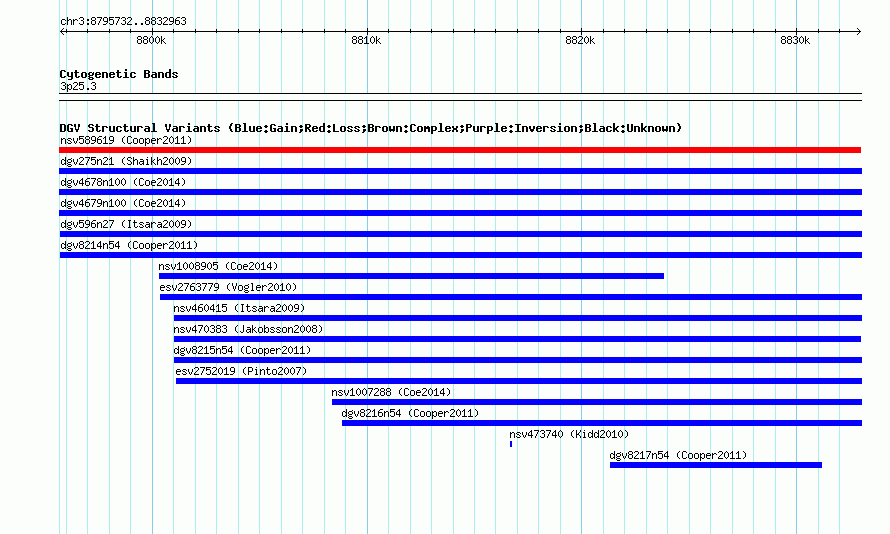 Variant DetailsVariant: nssv689073| Internal ID | 15079039 | | Landmark | | | Location Information | | | Cytoband | 3p25.3 | | Allele length | | Assembly | Allele length | | hg38 | 37232 | | hg19 | 37232 | | hg18 | 37232 | | hg17 | 37232 |