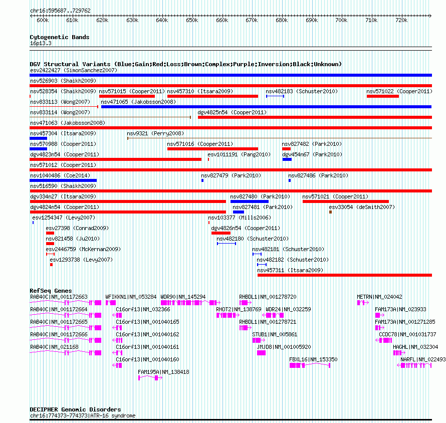 Variant DetailsVariant: nssv689357| Internal ID | 15079323 | | Landmark | | | Location Information | | | Cytoband | 16p13.3 | | Allele length | | Assembly | Allele length | | hg38 | 134076 | | hg19 | 134076 | | hg18 | 134076 | | hg17 | 134076 |