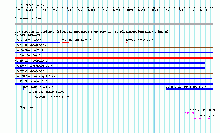 Variant DetailsVariant: nssv689867| Internal ID | 15426519 | | Landmark | | | Location Information | | | Cytoband | 10p14 | | Allele length | | Assembly | Allele length | | hg38 | 158921 | | hg19 | 158921 | | hg18 | 158921 | | hg17 | 158921 |