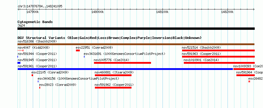 Variant DetailsVariant: nssv691231| Internal ID | 15427883 | | Landmark | | | Location Information | | | Cytoband | 3q24 | | Allele length | | Assembly | Allele length | | hg38 | 364312 | | hg19 | 364312 | | hg18 | 364312 | | hg17 | 364312 |