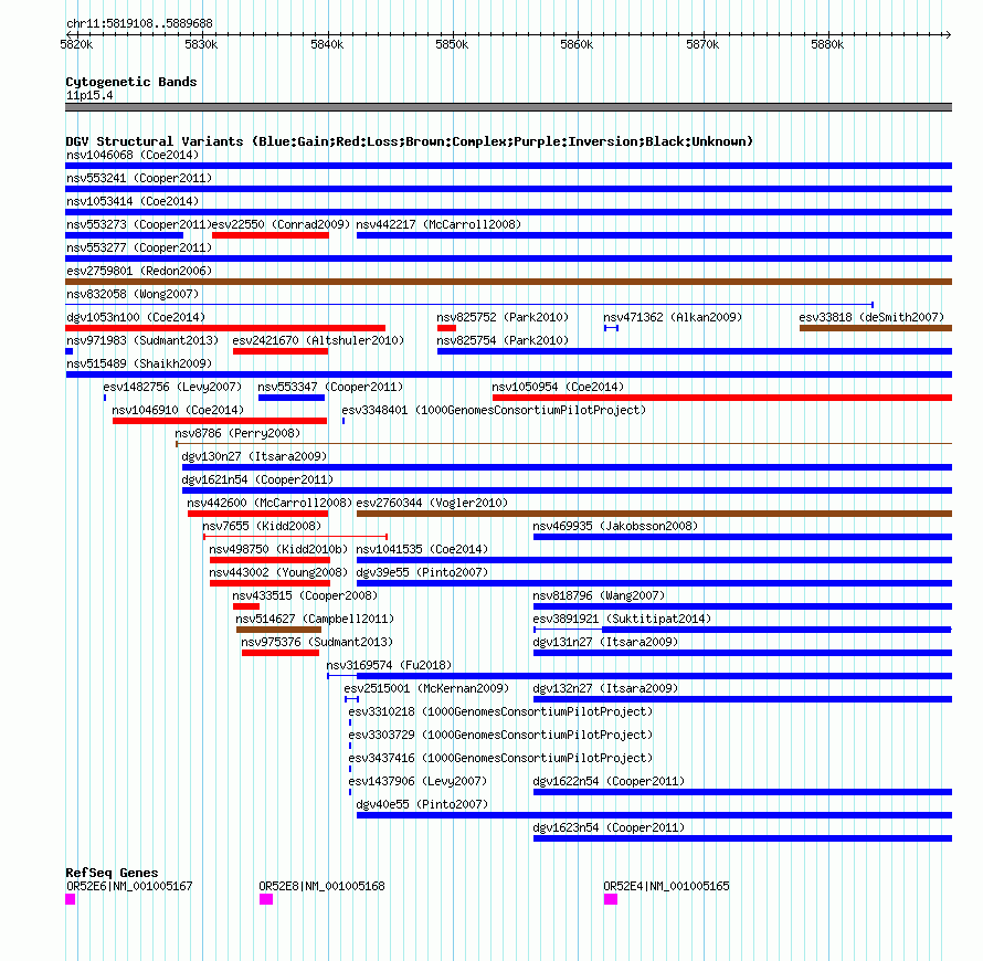 Variant DetailsVariant: nssv691247| Internal ID | 15427899 | | Landmark | | | Location Information | | | Cytoband | 11p15.4 | | Allele length | | Assembly | Allele length | | hg38 | 70581 | | hg19 | 70581 | | hg18 | 70581 | | hg17 | 70581 |