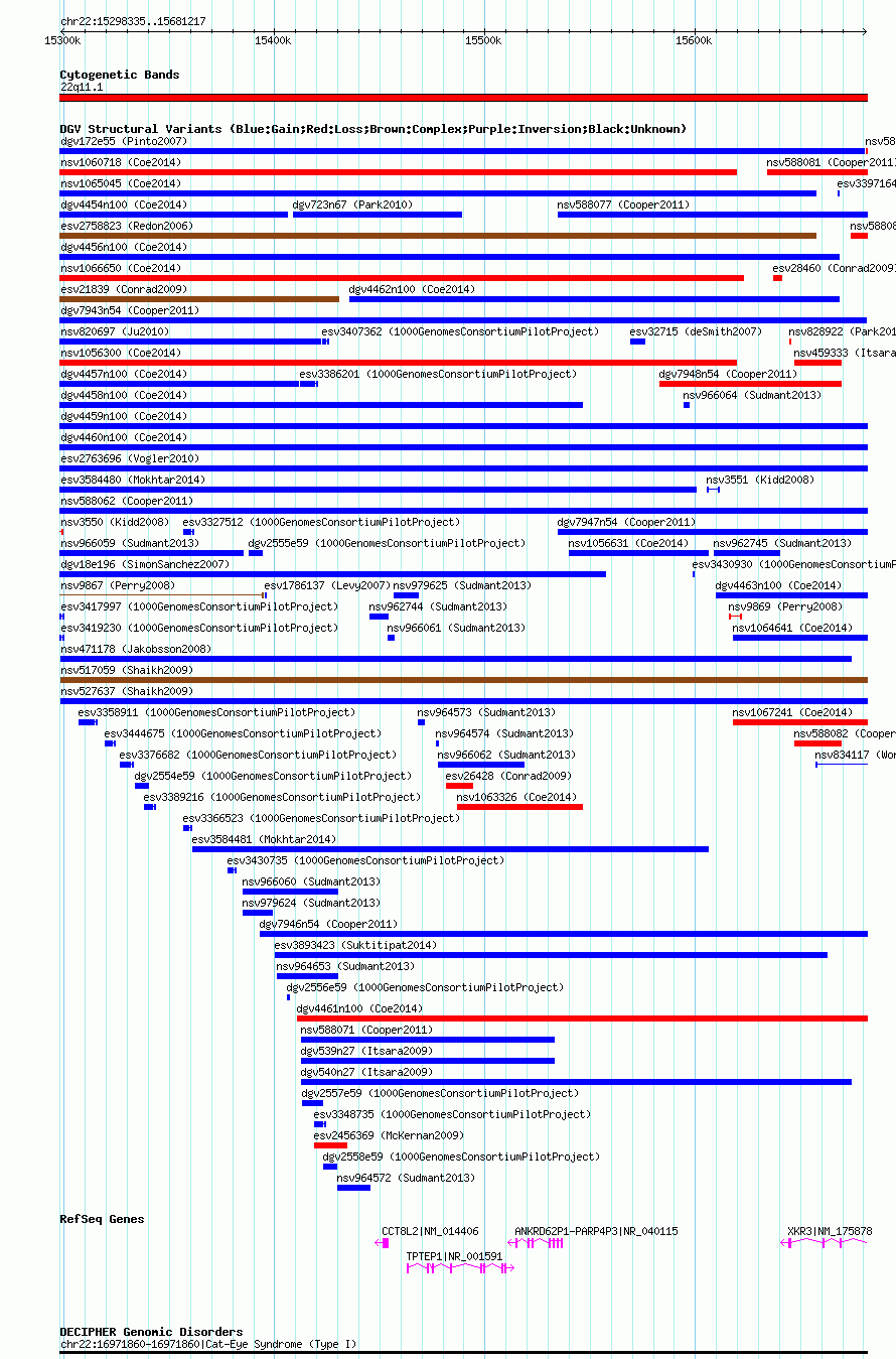 Variant DetailsVariant: nssv692451| Internal ID | 15429103 | | Landmark | | | Location Information | | | Cytoband | 22q11.1 | | Allele length | | Assembly | Allele length | | hg38 | 382732 | | hg19 | 382883 | | hg18 | 382883 | | hg17 | 382883 |