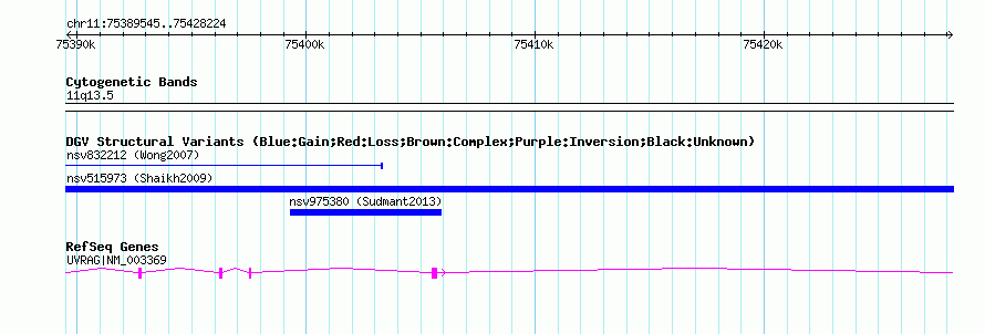 Variant DetailsVariant: nssv694527| Internal ID | 15431179 | | Landmark | | | Location Information | | | Cytoband | 11q13.5 | | Allele length | | Assembly | Allele length | | hg38 | 38680 | | hg19 | 38680 | | hg18 | 38680 | | hg17 | 38680 |