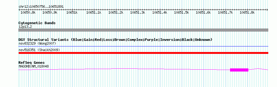 | Variant Type | CNV loss | Copy Number | | Allele State | Heterozygous | Allele Origin | | Probe Count | | Validation Flag | | Merged Status | S | Merged Variants | nsv516351 | Supporting Variants | | Samples | | Known Genes | MAGOHB | Method | SNP array | Analysis | Sample-level CNVs | Platform | GPL6434 | Comments | | Reference | Shaikh_et_al_2009 | Pubmed ID | 19592680 | Accession Number(s) | nssv695668