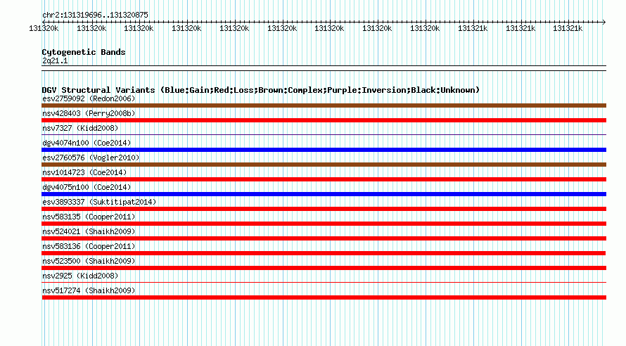 Variant DetailsVariant: nssv696138| Internal ID | 15086104 | | Landmark | | | Location Information | | | Cytoband | 2q21.1 | | Allele length | | Assembly | Allele length | | hg38 | 1180 | | hg19 | 1180 | | hg18 | 1180 | | hg17 | 1180 |