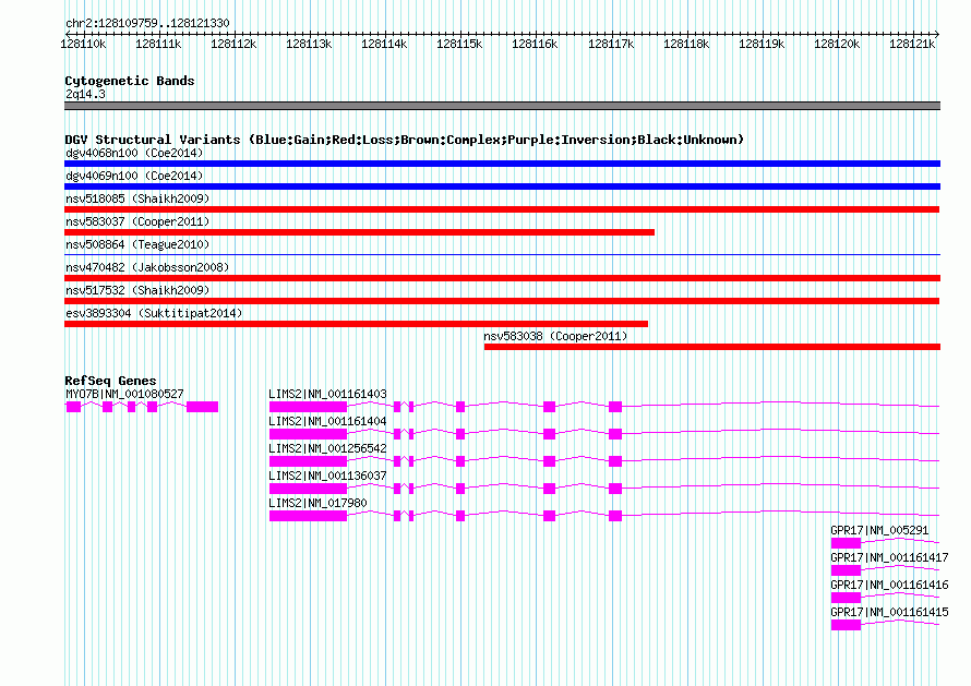 | | Variant Type | CNV loss | | Copy Number | | | Allele State | Heterozygous | | Allele Origin | | | Probe Count | | | Validation Flag | | | Merged Status | S | | Merged Variants | nsv517532 | | Supporting Variants | | | Samples | | | Known Genes | GPR17, LIMS2, MYO7B | | Method | SNP array | | Analysis | Sample-level CNVs | | Platform | GPL6434 | | Comments | | | Reference | Shaikh_et_al_2009 | | Pubmed ID | 19592680 | | Accession Number(s) | nssv696373