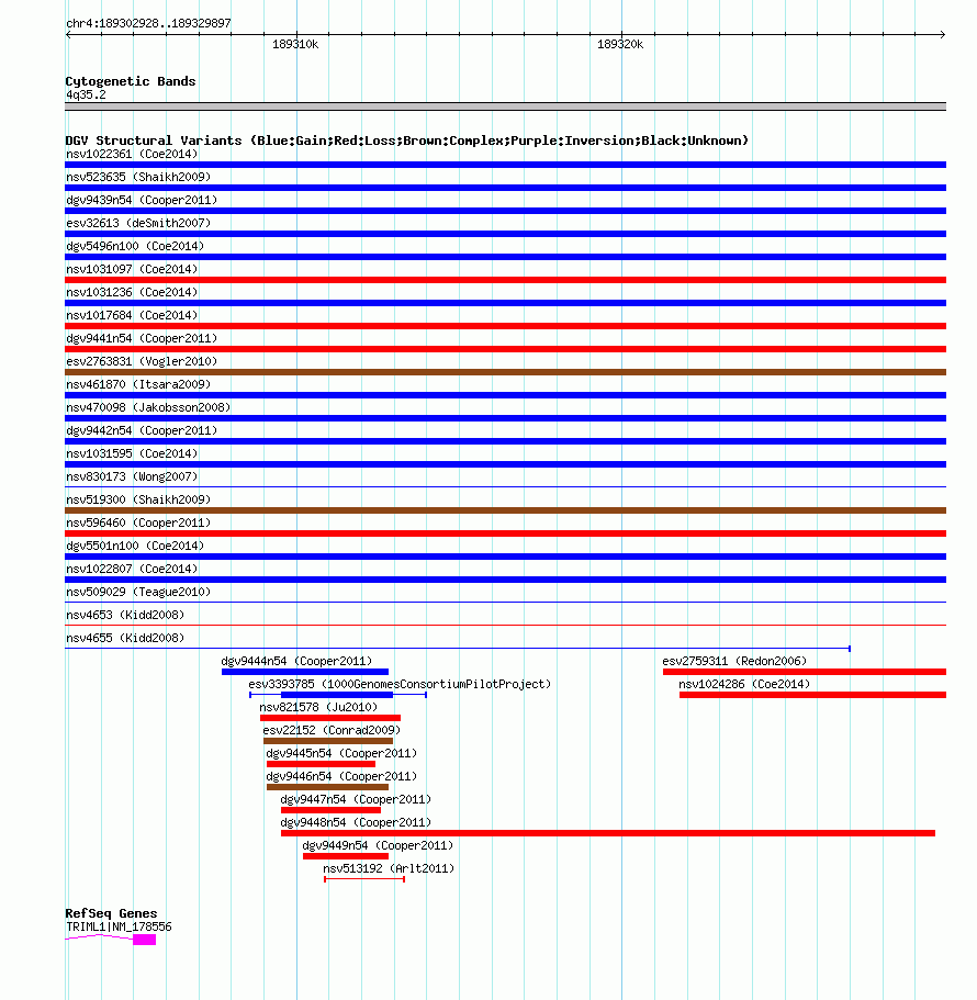 Variant DetailsVariant: nssv696505Internal ID | 15086471 | Landmark | | Location Information | | Cytoband | 4q35.2 | Allele length | Assembly | Allele length | hg38 | 26970 | hg19 | 26970 | hg18 | 26970 | hg17 | 26970 |