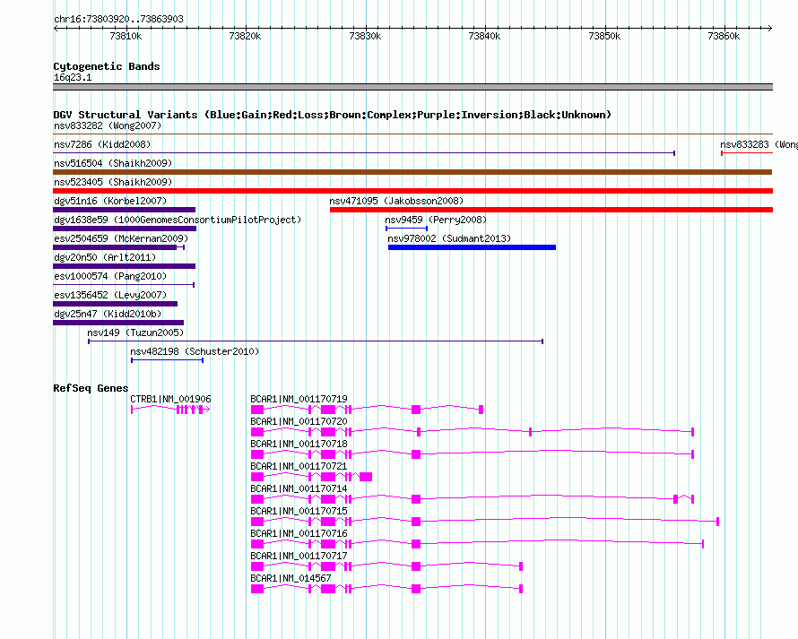 Variant DetailsVariant: nssv697410| Internal ID | 15434062 | | Landmark | | | Location Information | | | Cytoband | 16q23.1 | | Allele length | | Assembly | Allele length | | hg38 | 59984 | | hg19 | 59984 | | hg18 | 59984 | | hg17 | 59984 |
