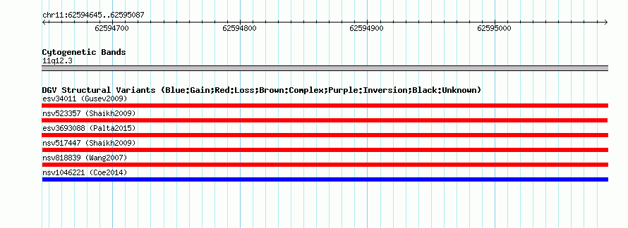 Variant DetailsVariant: nssv697497| Internal ID | 15434149 | | Landmark | | | Location Information | | | Cytoband | 11q12.3 | | Allele length | | Assembly | Allele length | | hg38 | 443 | | hg19 | 443 | | hg18 | 443 | | hg17 | 443 |