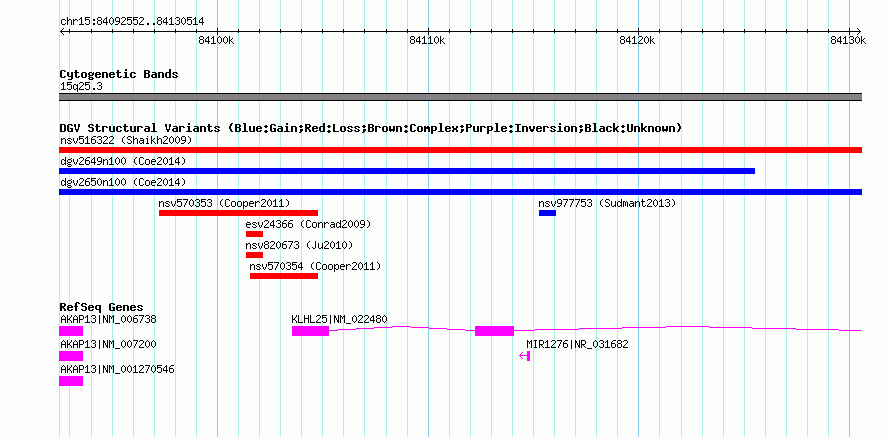 | | Variant Type | CNV loss | | Copy Number | | | Allele State | Heterozygous | | Allele Origin | | | Probe Count | | | Validation Flag | | | Merged Status | S | | Merged Variants | nsv516322 | | Supporting Variants | | | Samples | | | Known Genes | AKAP13, KLHL25, MIR1276 | | Method | SNP array | | Analysis | Sample-level CNVs | | Platform | GPL6434 | | Comments | | | Reference | Shaikh_et_al_2009 | | Pubmed ID | 19592680 | | Accession Number(s) | nssv697636