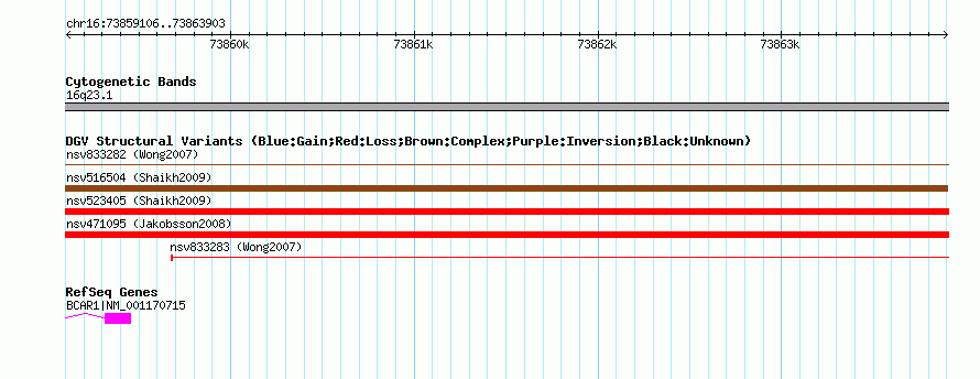 | | Variant Type | CNV loss | | Copy Number | | | Allele State | Heterozygous | | Allele Origin | | | Probe Count | | | Validation Flag | | | Merged Status | S | | Merged Variants | nsv516504 | | Supporting Variants | | | Samples | | | Known Genes | BCAR1 | | Method | SNP array | | Analysis | Sample-level CNVs | | Platform | GPL6434 | | Comments | | | Reference | Shaikh_et_al_2009 | | Pubmed ID | 19592680 | | Accession Number(s) | nssv697679