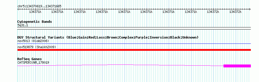 Variant DetailsVariant: nssv698623| Internal ID | 15435275 | | Landmark | | | Location Information | | | Cytoband | 5q31.1 | | Allele length | | Assembly | Allele length | | hg38 | 1047 | | hg19 | 1047 | | hg18 | 1047 | | hg17 | 1047 |