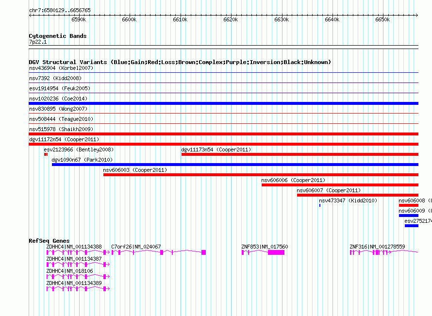 Variant DetailsVariant: nssv699517| Internal ID | 15089483 | | Landmark | | | Location Information | | | Cytoband | 7p22.1 | | Allele length | | Assembly | Allele length | | hg38 | 76637 | | hg19 | 76637 | | hg18 | 76637 | | hg17 | 76637 |
