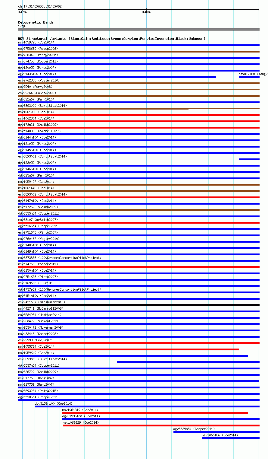 Variant DetailsVariant: nssv699714| Internal ID | 15436366 | | Landmark | | | Location Information | | | Cytoband | 17q12 | | Allele length | | Assembly | Allele length | | hg38 | 19416 | | hg19 | 19405 | | hg18 | 19405 | | hg17 | 19405 |