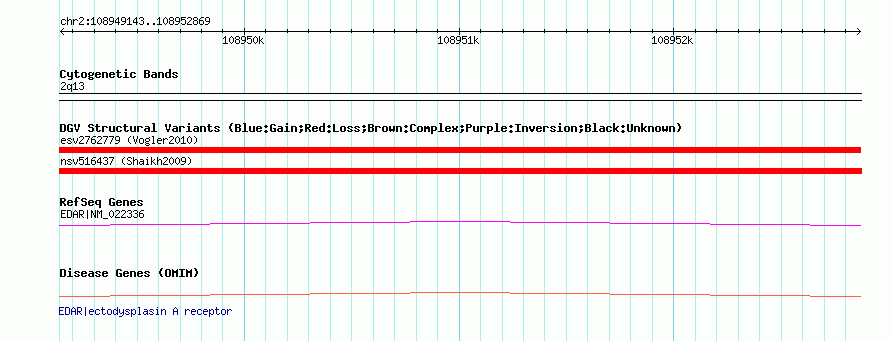 | | Variant Type | CNV loss | | Copy Number | | | Allele State | Heterozygous | | Allele Origin | | | Probe Count | | | Validation Flag | | | Merged Status | S | | Merged Variants | nsv516437 | | Supporting Variants | | | Samples | | | Known Genes | EDAR | | Method | SNP array | | Analysis | Sample-level CNVs | | Platform | GPL6434 | | Comments | | | Reference | Shaikh_et_al_2009 | | Pubmed ID | 19592680 | | Accession Number(s) | nssv700681