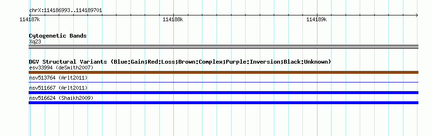 Variant DetailsVariant: nssv700825| Internal ID | 15437477 | | Landmark | | | Location Information | | | Cytoband | Xq23 | | Allele length | | Assembly | Allele length | | hg38 | 2709 | | hg19 | 2709 | | hg18 | 2709 | | hg17 | 2709 |