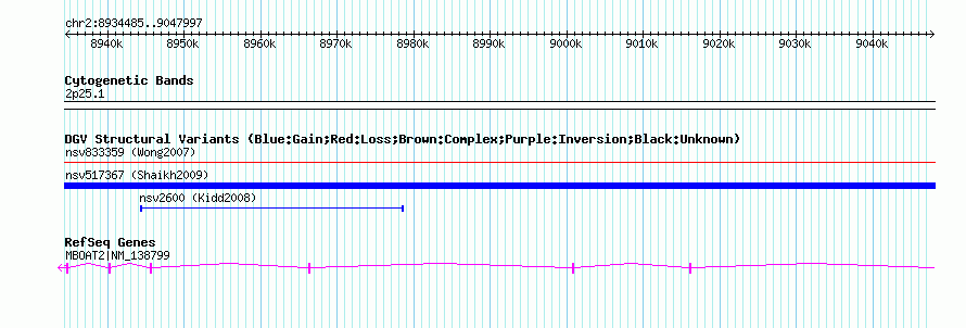 Variant DetailsVariant: nssv701848| Internal ID | 15091814 | | Landmark | | | Location Information | | | Cytoband | 2p25.1 | | Allele length | | Assembly | Allele length | | hg38 | 113514 | | hg19 | 113513 | | hg18 | 113513 | | hg17 | 113513 |