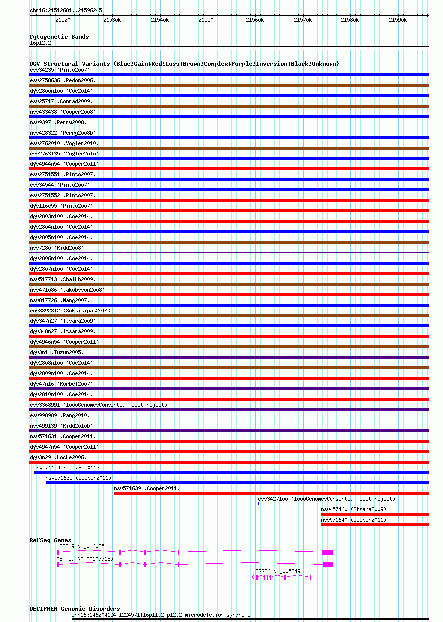Variant DetailsVariant: nssv702216Internal ID | 15092182 | Landmark | | Location Information | | Cytoband | 16p12.2 | Allele length | Assembly | Allele length | hg38 | 83565 | hg19 | 83565 | hg18 | 83565 | hg17 | 83565 |