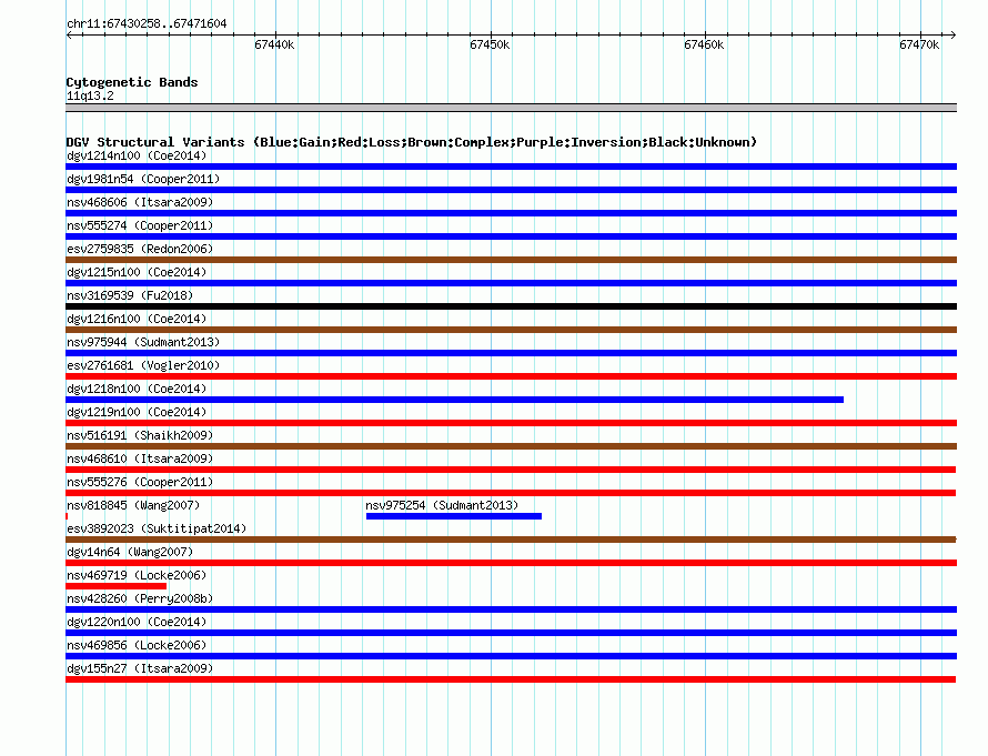 Variant DetailsVariant: nssv703410| Internal ID | 15440062 | | Landmark | | | Location Information | | | Cytoband | 11q13.2 | | Allele length | | Assembly | Allele length | | hg38 | 41347 | | hg19 | 41347 | | hg18 | 41347 | | hg17 | 41347 |