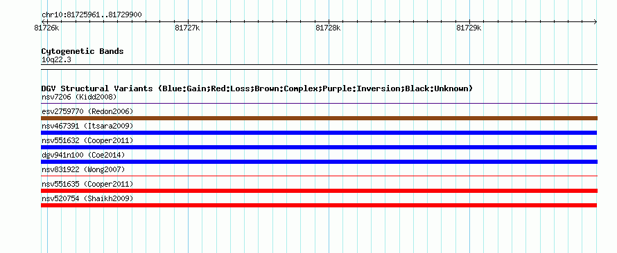 Variant DetailsVariant: nssv703954| Internal ID | 15440606 | | Landmark | | | Location Information | | | Cytoband | 10q22.3 | | Allele length | | Assembly | Allele length | | hg38 | 3940 | | hg19 | 3940 | | hg18 | 3940 | | hg17 | 3940 |