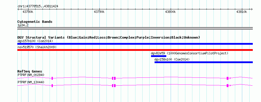 Variant DetailsVariant: nssv705110| Internal ID | 15441762 | | Landmark | | | Location Information | | | Cytoband | 1p34.2 | | Allele length | | Assembly | Allele length | | hg38 | 32910 | | hg19 | 32910 | | hg18 | 32910 | | hg17 | 32910 |