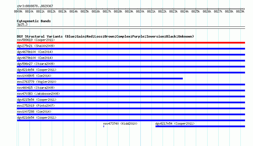 Variant DetailsVariant: nssv705314| Internal ID | 15095280 | | Landmark | | | Location Information | | | Cytoband | 3p25.3 | | Allele length | | Assembly | Allele length | | hg38 | 20490 | | hg19 | 20490 | | hg18 | 20490 | | hg17 | 20490 |