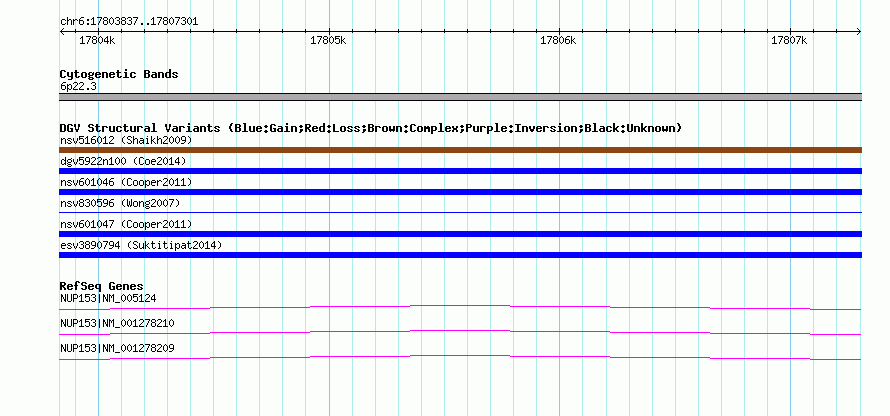 | Variant Type | CNV loss | Copy Number | | Allele State | Heterozygous | Allele Origin | | Probe Count | | Validation Flag | | Merged Status | S | Merged Variants | nsv516012 | Supporting Variants | | Samples | | Known Genes | NUP153 | Method | SNP array | Analysis | Sample-level CNVs | Platform | GPL6434 | Comments | | Reference | Shaikh_et_al_2009 | Pubmed ID | 19592680 | Accession Number(s) | nssv705642