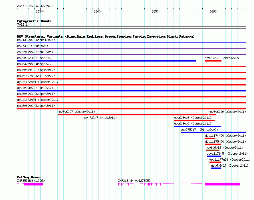 Variant DetailsVariant: nssv705793| Internal ID | 15095759 | | Landmark | | | Location Information | | | Cytoband | 7p22.1 | | Allele length | | Assembly | Allele length | | hg38 | 39397 | | hg19 | 39397 | | hg18 | 39397 | | hg17 | 39397 |
