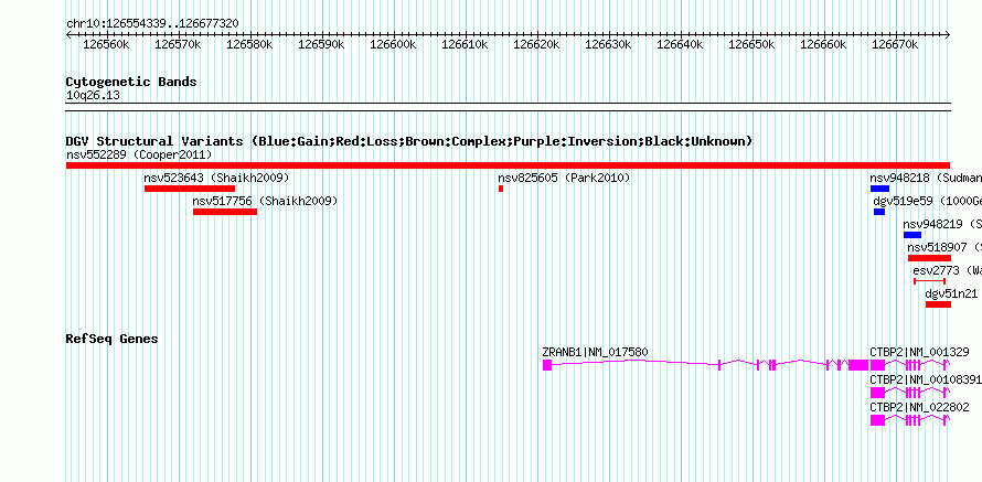 | | Variant Type | CNV loss | | Copy Number | | | Allele State | | | Allele Origin | | | Probe Count | | | Validation Flag | | | Merged Status | S | | Merged Variants | nsv552289 | | Supporting Variants | | | Samples | | | Known Genes | CTBP2, ZRANB1 | | Method | SNP array | | Analysis | Illumina SNP array copy number analysis | | Platform | Not reported | | Comments | | | Reference | Cooper_et_al_2011 | | Pubmed ID | 21841781 | | Accession Number(s) | nssv760492