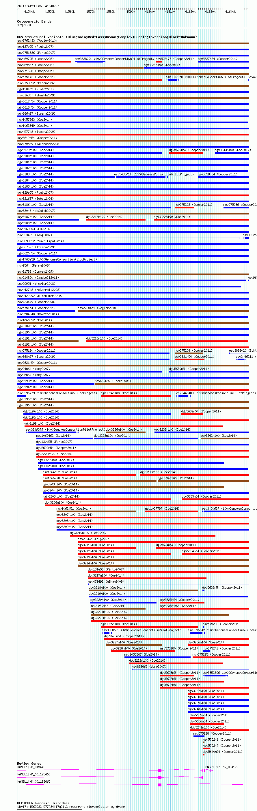 Variant DetailsVariant: nssv872390| Internal ID | 16166346 | | Landmark | | | Location Information | | | Cytoband | 17q21.31 | | Allele length | | Assembly | Allele length | | hg38 | 115028 | | hg19 | 115028 | | hg18 | 114992 |