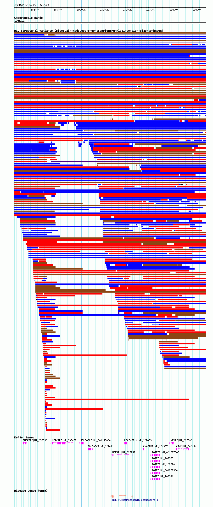 Variant DetailsVariant: nssv9304| Internal ID | 15540255 | | Landmark | | | Location Information | | | Cytoband | 15q11.1 | | Allele length | | Assembly | Allele length | | hg38 | 822718 | | hg19 | 822794 | | hg18 | 827439 | | hg17 | 827439 |