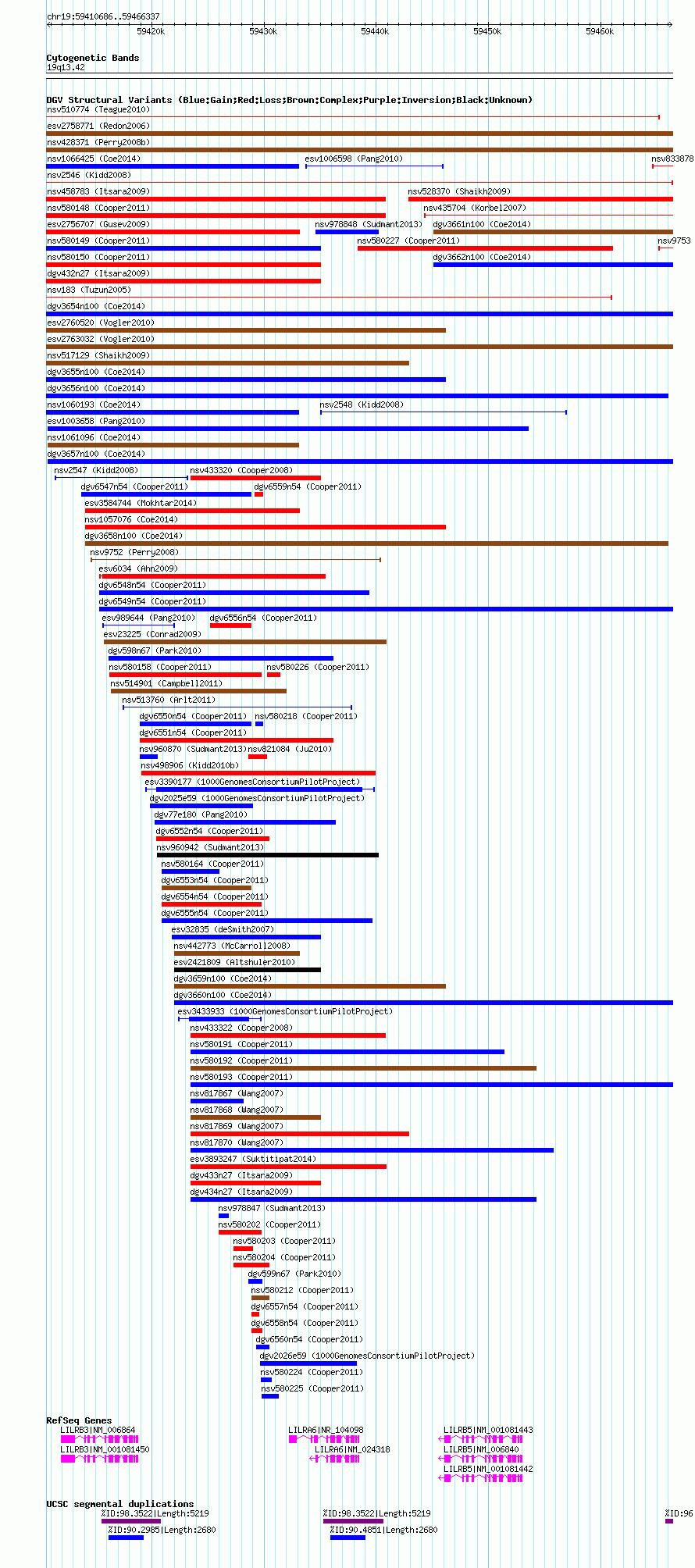 Variant DetailsVariant: nssv9341| Internal ID | 15193606 | | Landmark | | | Location Information | | | Cytoband | 19q13.42 | | Allele length | | Assembly | Allele length | | hg38 | 55667 | | hg19 | 55652 | | hg18 | 55652 | | hg17 | 55652 |