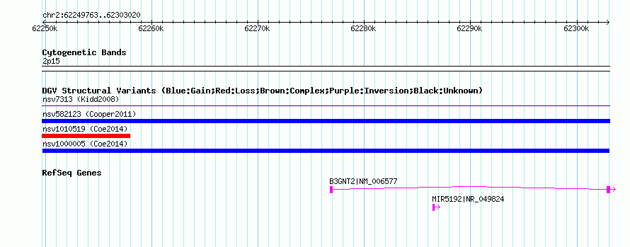 | | Variant Type | CNV gain | | Copy Number | | | Allele State | | | Allele Origin | | | Probe Count | | | Validation Flag | | | Merged Status | M | | Merged Variants | | | Supporting Variants | nssv3577253 | | Samples | | | Known Genes | B3GNT2, MIR5192 | | Method | SNP array | | Analysis | Affymetrix SNP array copy number analysis | | Platform | Affymetrix SNP Array 6.0 | | Comments | | | Reference | Coe_et_al_2014 | | Pubmed ID | 25217958 | | Accession Number(s) | nsv1000005