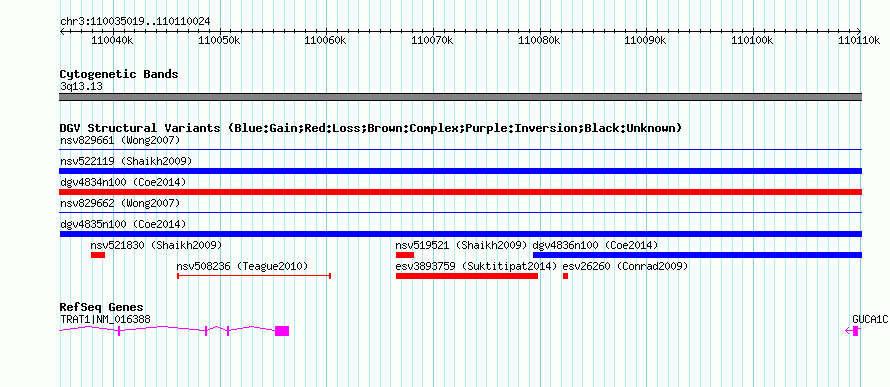 | | Variant Type | CNV gain | | Copy Number | | | Allele State | | | Allele Origin | | | Probe Count | | | Validation Flag | | | Merged Status | M | | Merged Variants | dgv4835n100 | | Supporting Variants | nssv3735247, nssv3604401 | | Samples | | | Known Genes | GUCA1C, TRAT1 | | Method | SNP array | | Analysis | Affymetrix SNP array copy number analysis | | Platform | Affymetrix SNP Array 6.0 | | Comments | | | Reference | Coe_et_al_2014 | | Pubmed ID | 25217958 | | Accession Number(s) | nsv1000179