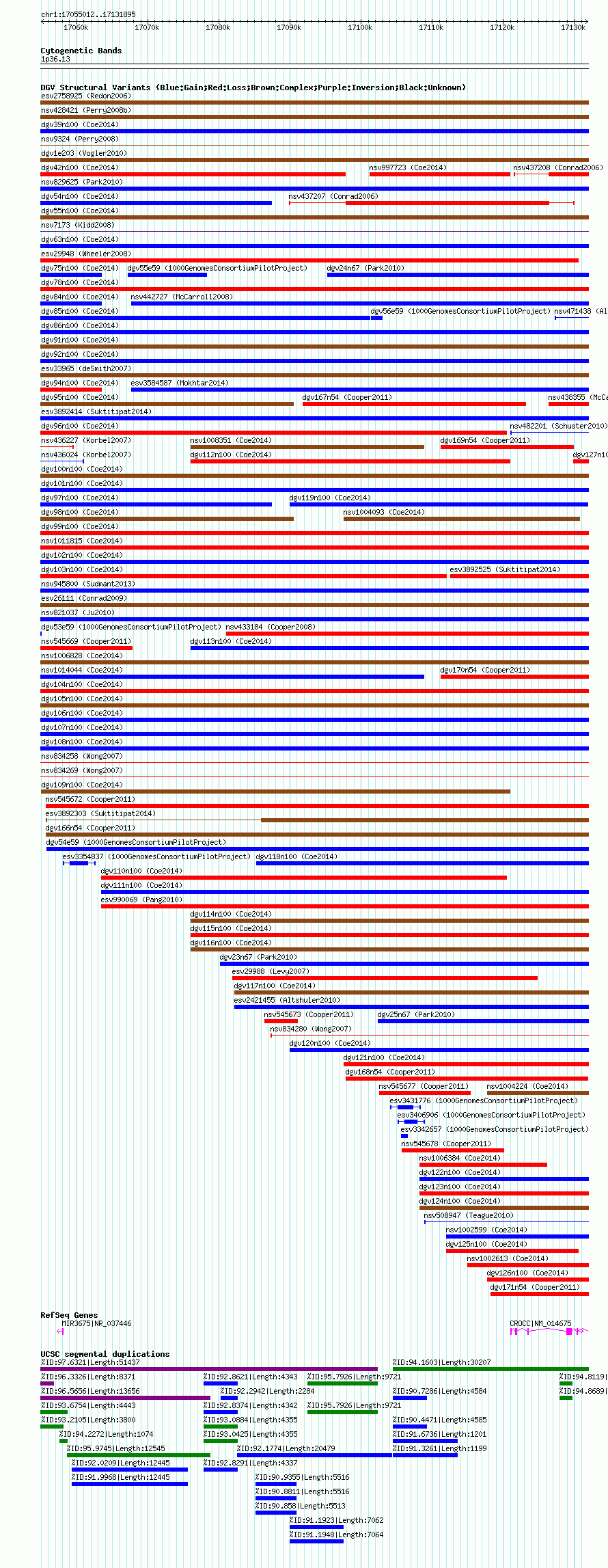 Variant DetailsVariant: nsv1000195| Internal ID | 18742726 | | Landmark | | | Location Information | | | Cytoband | 1p36.13 | | Allele length | | Assembly | Allele length | | hg38 | 76884 | | hg19 | 76884 | | hg18 | 76884 |