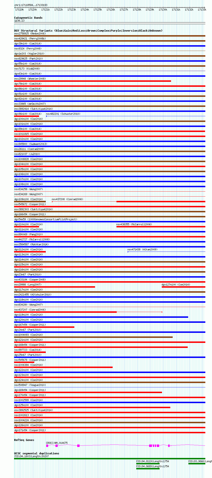 Variant DetailsVariant: nsv1000311| Internal ID | 18742842 | | Landmark | | | Location Information | | | Cytoband | 1p36.13 | | Allele length | | Assembly | Allele length | | hg38 | 14610 | | hg19 | 14610 | | hg18 | 14610 |