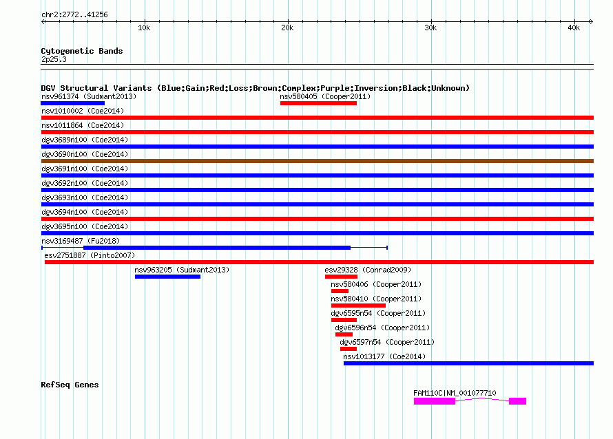 Variant DetailsVariant: nsv1000745| Internal ID | 19089962 | | Landmark | | | Location Information | | | Cytoband | 2p25.3 | | Allele length | | Assembly | Allele length | | hg38 | 38485 | | hg19 | 38485 | | hg18 | 38485 |