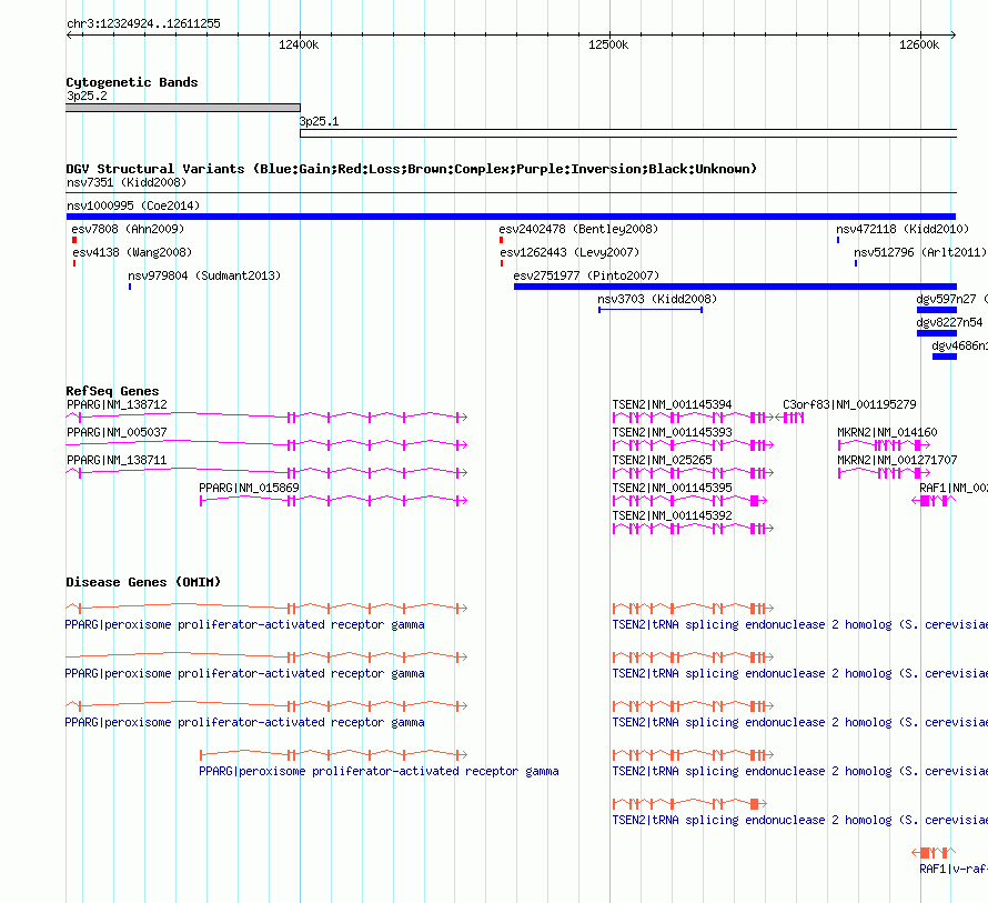 |  | Variant Type | CNV gain |  | Copy Number |  |  | Allele State |  |  | Allele Origin |  |  | Probe Count |  |  | Validation Flag |  |  | Merged Status | M |  | Merged Variants |  |  | Supporting Variants | nssv3591969 |  | Samples |  |  | Known Genes | C3orf83, MKRN2, PPARG, RAF1, TSEN2 |  | Method | SNP array |  | Analysis | Affymetrix SNP array copy number analysis |  | Platform | Affymetrix SNP Array 6.0 |  | Comments |  |  | Reference | Coe_et_al_2014 |  | Pubmed ID | 25217958 |  | Accession Number(s) | nsv1000995