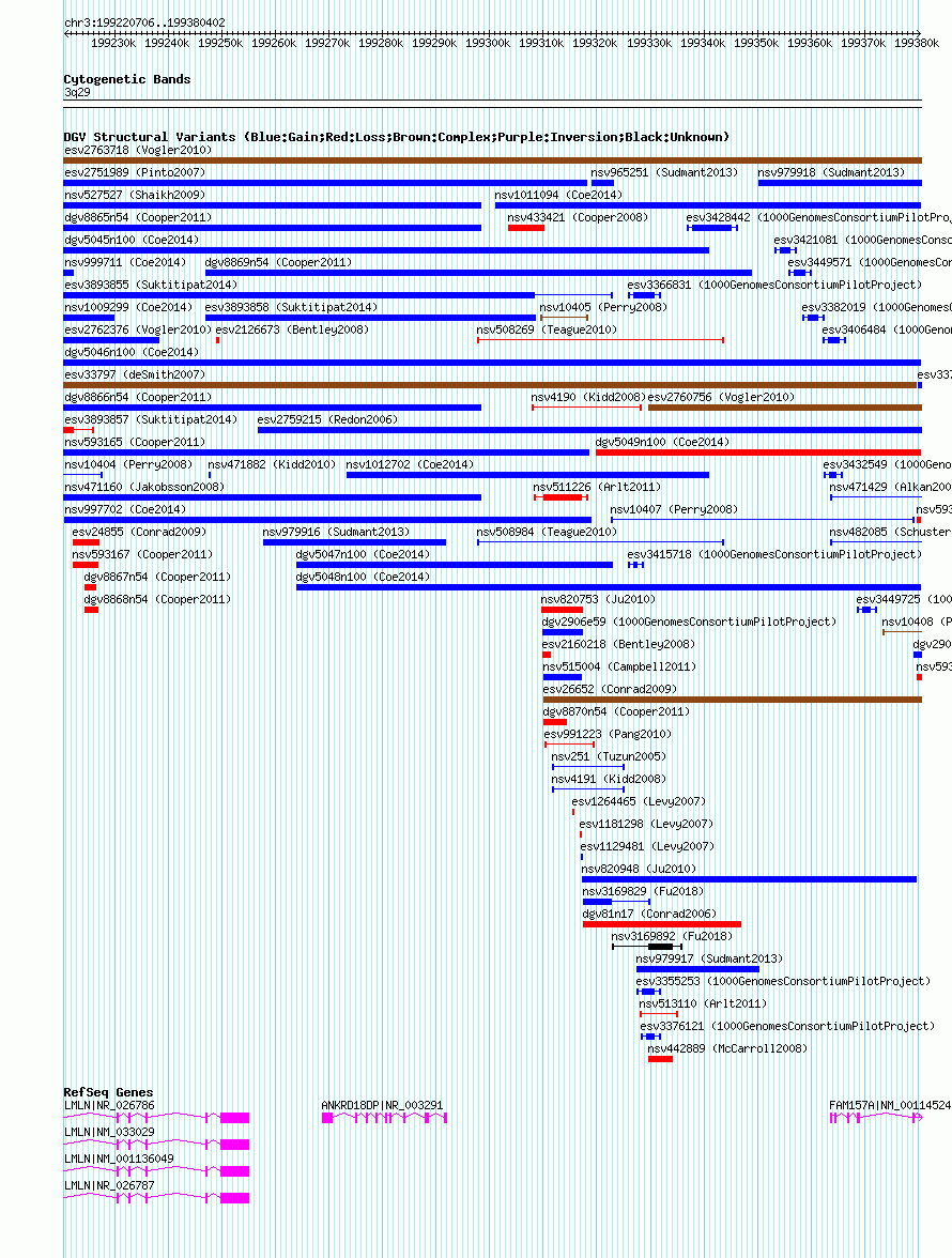 Variant DetailsVariant: nsv1001210| Internal ID | 19090427 | | Landmark | | | Location Information | | | Cytoband | 3q29 | | Allele length | | Assembly | Allele length | | hg38 | 159697 | | hg19 | 159697 | | hg18 | 159697 |