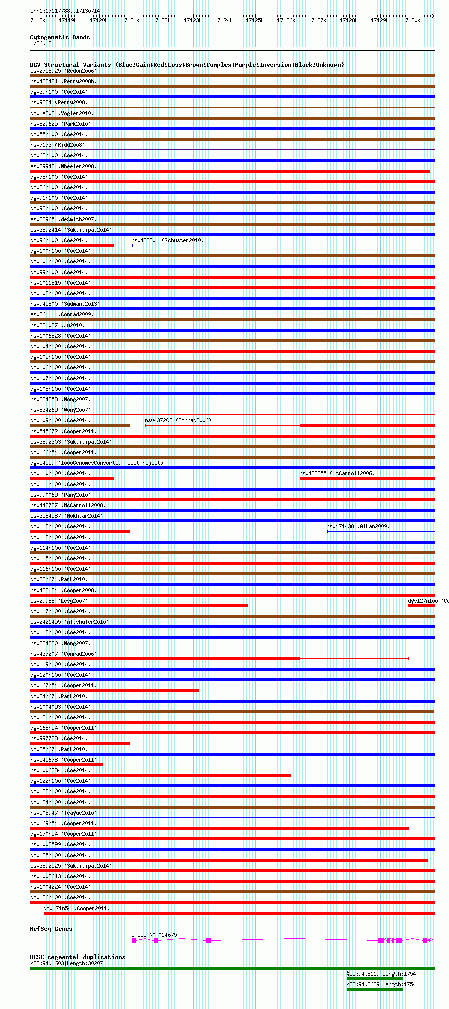 Variant DetailsVariant: nsv1001234| Internal ID | 18743765 | | Landmark | | | Location Information | | | Cytoband | 1p36.13 | | Allele length | | Assembly | Allele length | | hg38 | 12927 | | hg19 | 12927 | | hg18 | 12927 |