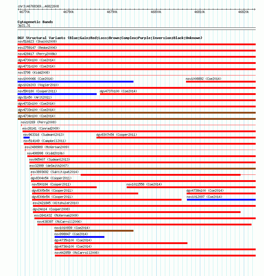 Variant DetailsVariant: nsv1001582| Internal ID | 19090799 | | Landmark | | | Location Information | | | Cytoband | 3p21.31 | | Allele length | | Assembly | Allele length | | hg38 | 54240 | | hg19 | 54240 | | hg18 | 54240 |