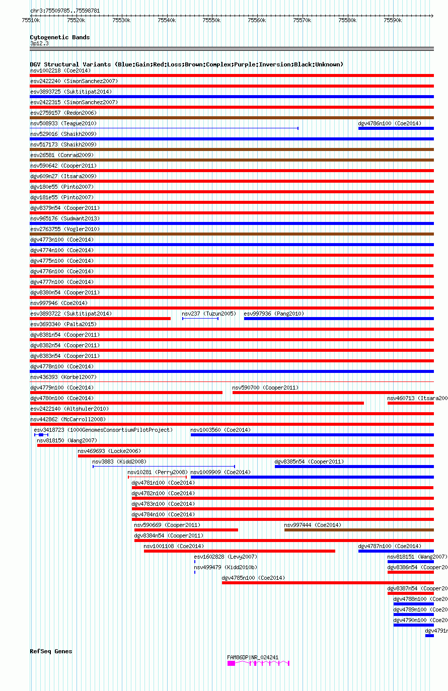 | | Variant Type | CNV loss | | Copy Number | | | Allele State | | | Allele Origin | | | Probe Count | | | Validation Flag | | | Merged Status | M | | Merged Variants | dgv4775n100 | | Supporting Variants | nssv3733041, nssv3733039, nssv3733035, nssv3602026, nssv3733033, nssv3733042, nssv3733045, nssv3733047, nssv3733038, nssv3733044, nssv3602021, nssv3602024, nssv3602018, nssv3602028, nssv3733046, nssv3602023, nssv3602030, nssv3733036, nssv3733034, nssv3602014, nssv3602020, nssv3733040, nssv3602025, nssv3602015, nssv3602017, nssv3602022, nssv3602012, nssv3733037, nssv3602013, nssv3602027, nssv3733043, nssv3602016, nssv3602029, nssv3602019 | | Samples | | | Known Genes | FAM86DP | | Method | SNP array | | Analysis | Affymetrix SNP array copy number analysis | | Platform | Affymetrix SNP Array 6.0 | | Comments | | | Reference | Coe_et_al_2014 | | Pubmed ID | 25217958 | | Accession Number(s) | nsv1001691